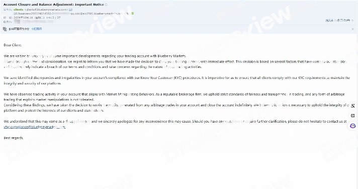 随后,该投资者决定提取剩余的1000美元本金。9月26日,他提交了提现申请。然而,10月1日,他收到了蓝莓市场发来的邮件通知,称平台决定关闭他的账户并扣除所有利润。平台并未给出具体原因,第一次成功提现后,账户内没有任何交易。这种突然的关户扣利润行为让投资者难以理解甚至愤怒。这种情况明显违反了正常的交易结算规则,让人对平台的诚信度产生怀疑。