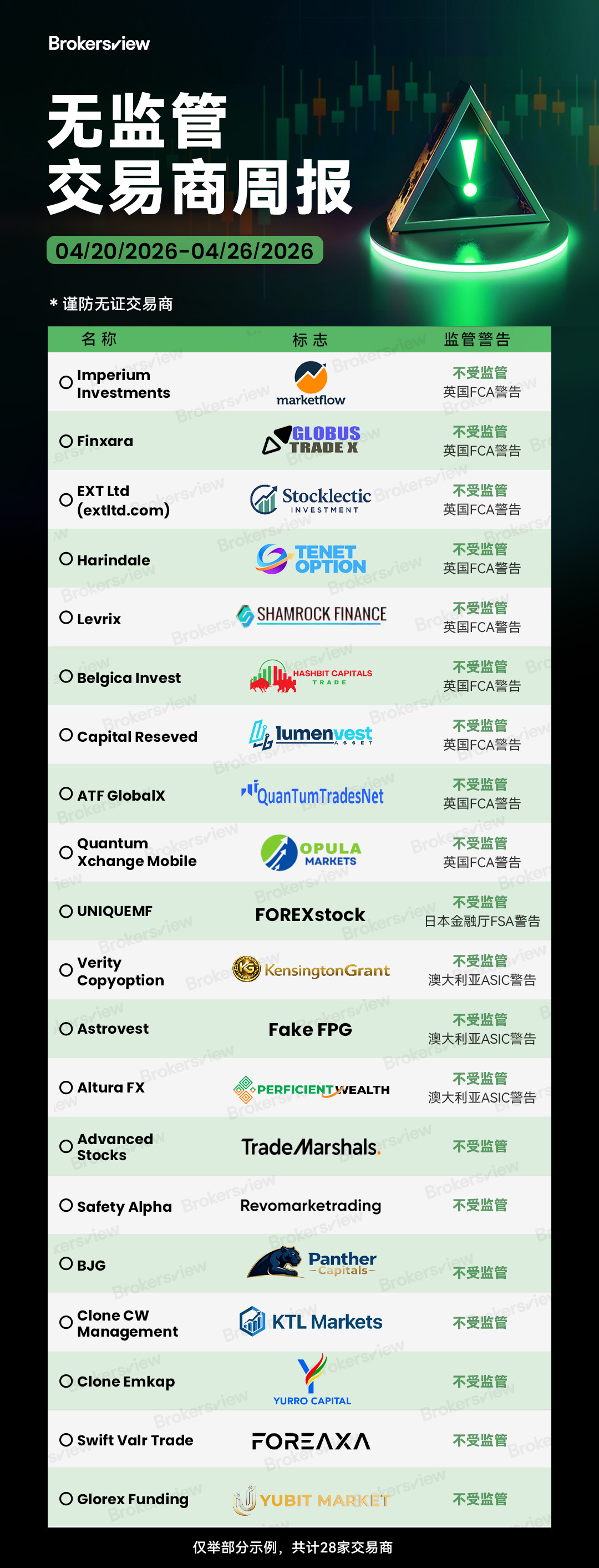 BrokersView 于2026 年 4 月 20 日至 26 日期间报告的无牌交易商: