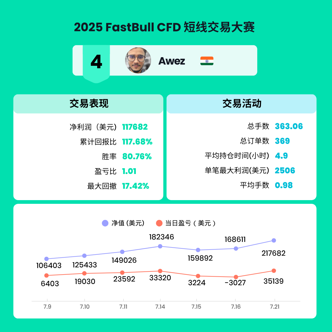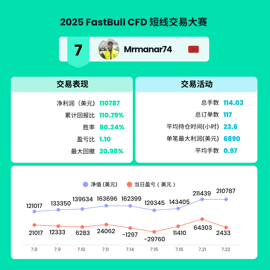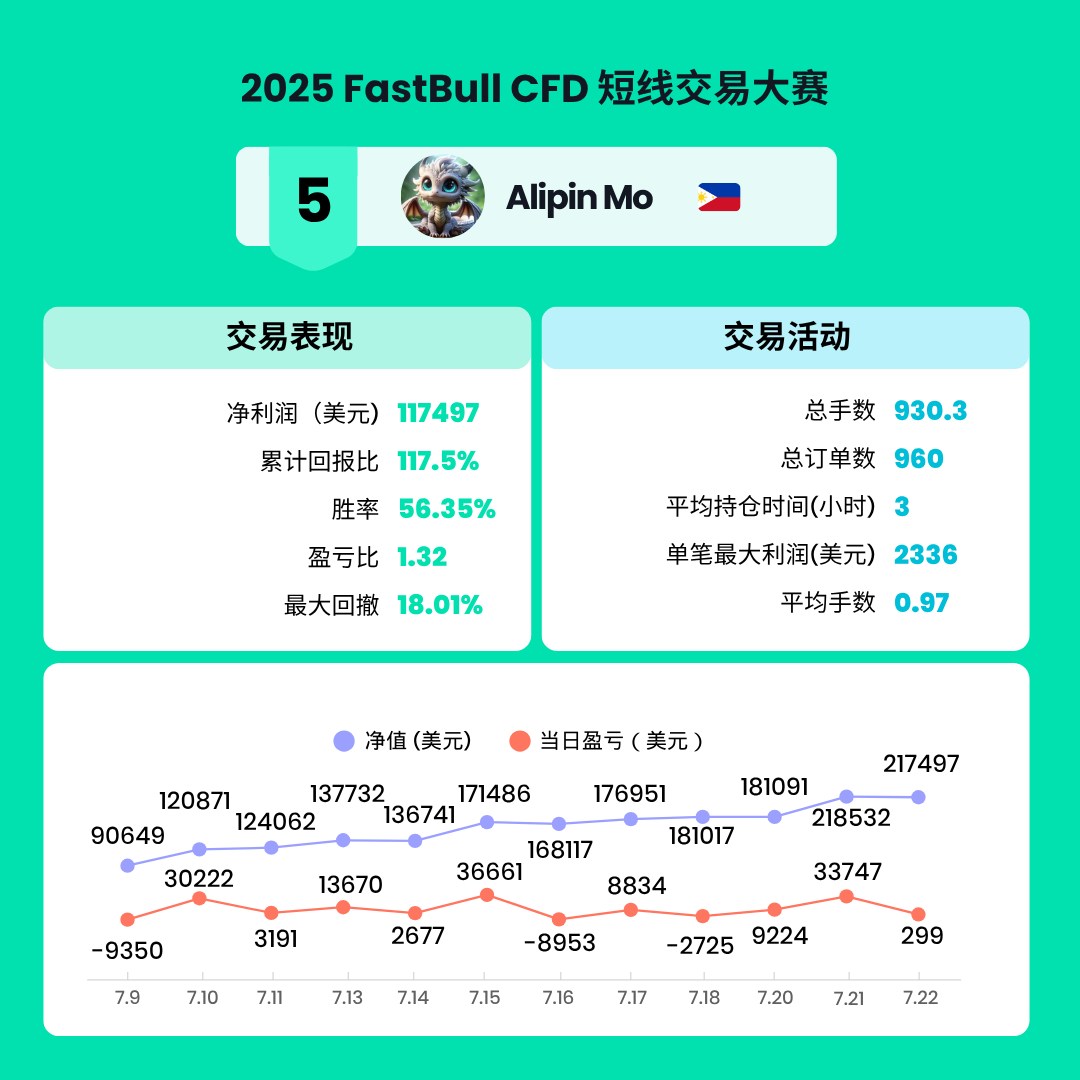 经过两周的激烈角逐,2025 FastBull CFD交易大赛S1赛季已于2025年7月22日圆满结束。在此次比赛中,共有来自全球的7199名交易者参与,大家在FastBull平台上展现了卓越的交易才能和策略。
