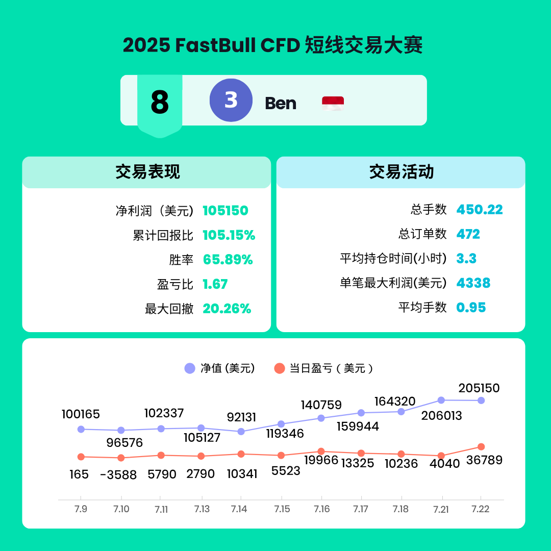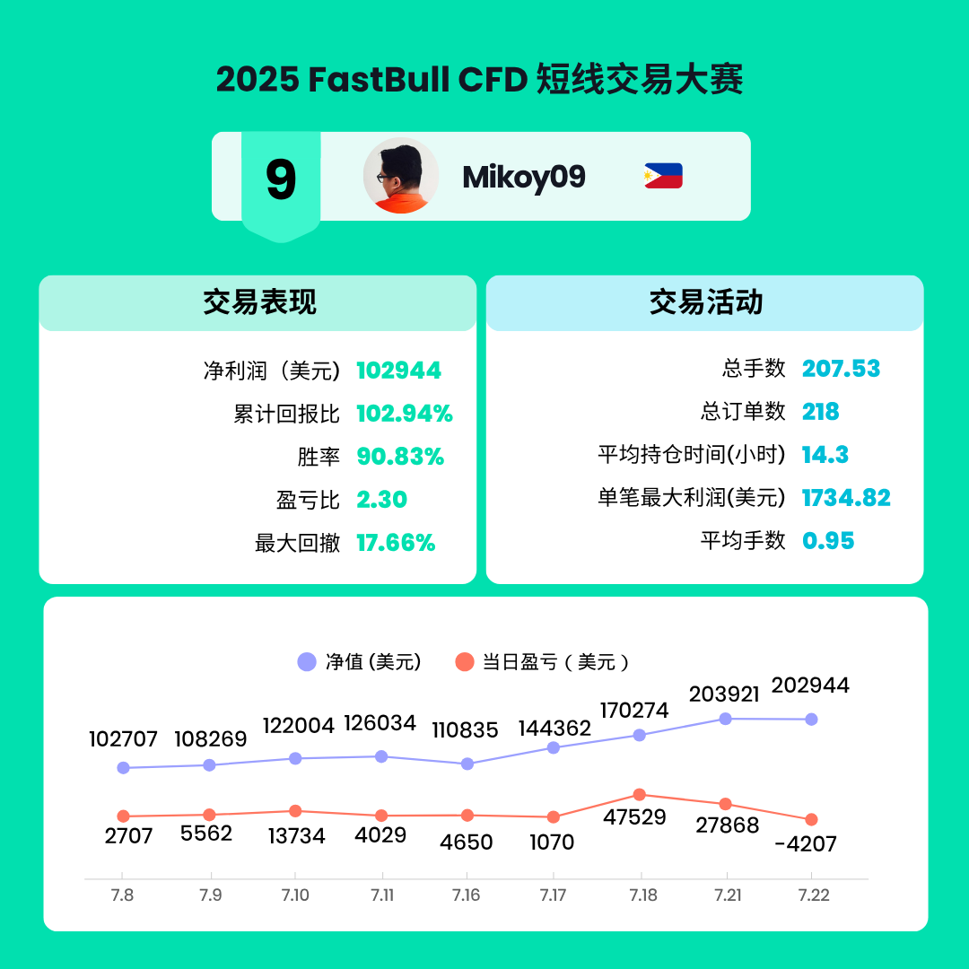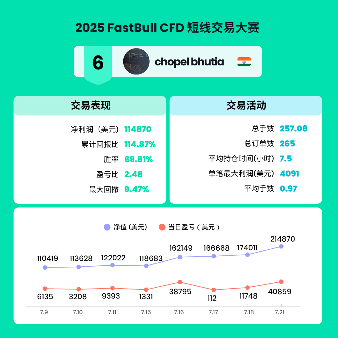 经过两周的激烈角逐,2025 FastBull CFD交易大赛S1赛季已于2025年7月22日圆满结束。在此次比赛中,共有来自全球的7199名交易者参与,大家在FastBull平台上展现了卓越的交易才能和策略。