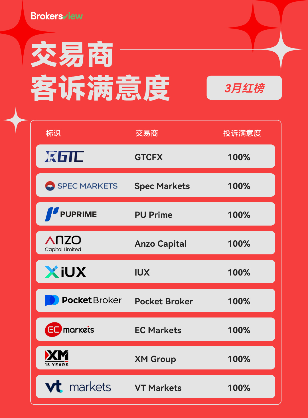 3月份有9家经纪公司实现了100%的完美投诉解决率,这体现了他们对客户服务和问题响应的坚定承诺: