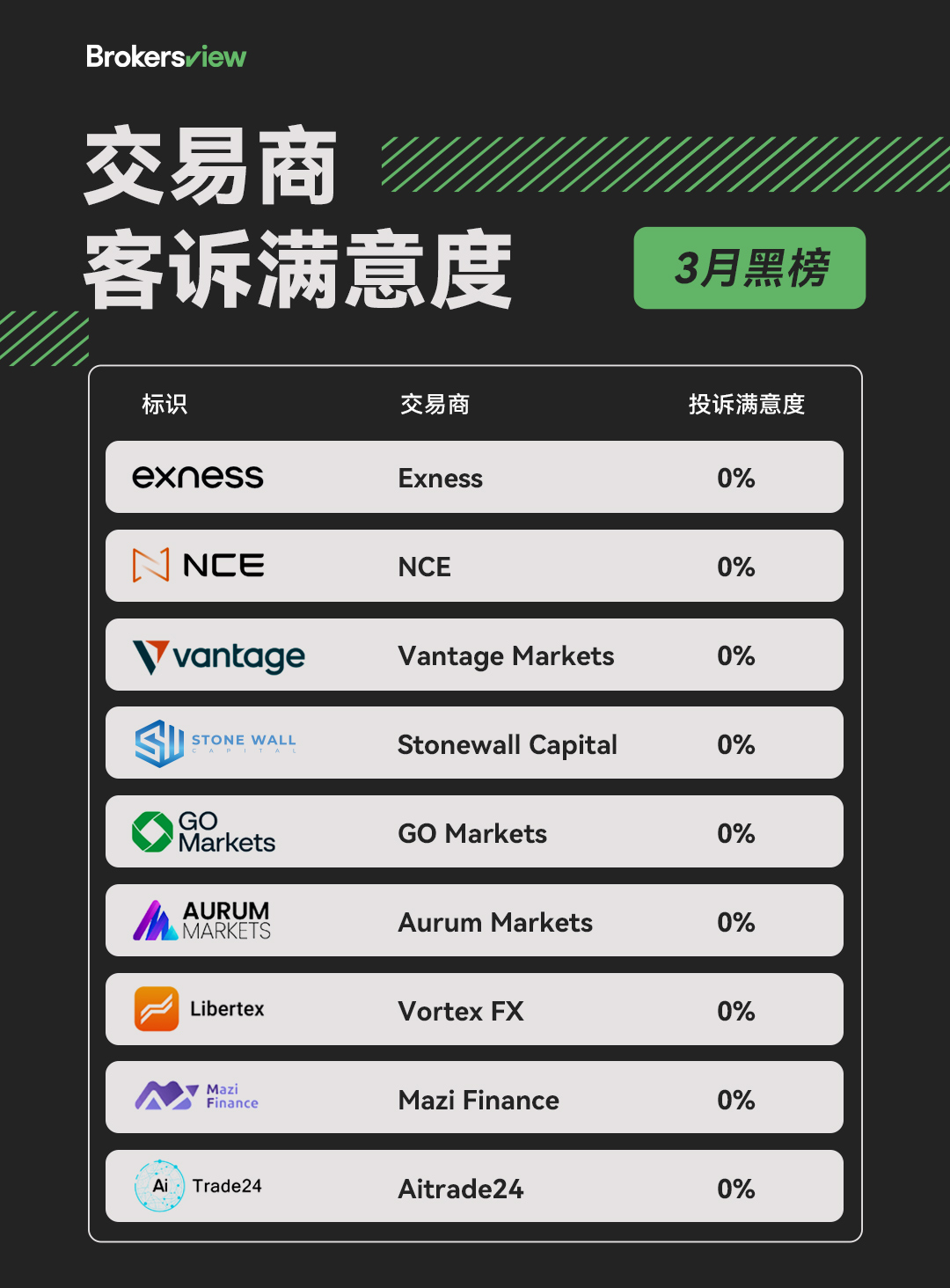 根据 BrokersView 发布的最新月度排名,2026 年 3 月经纪商投诉处理表现出现了明显的差距。