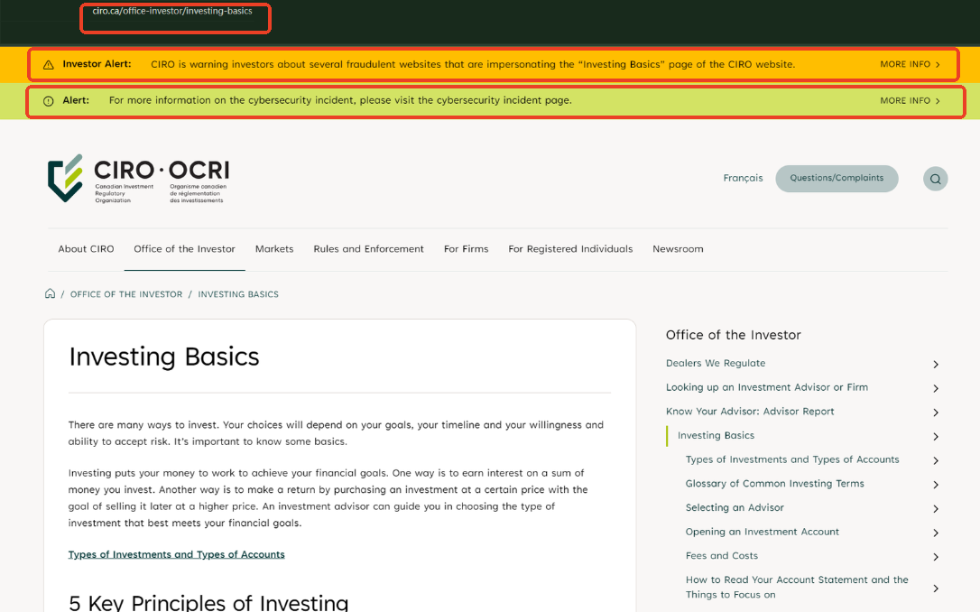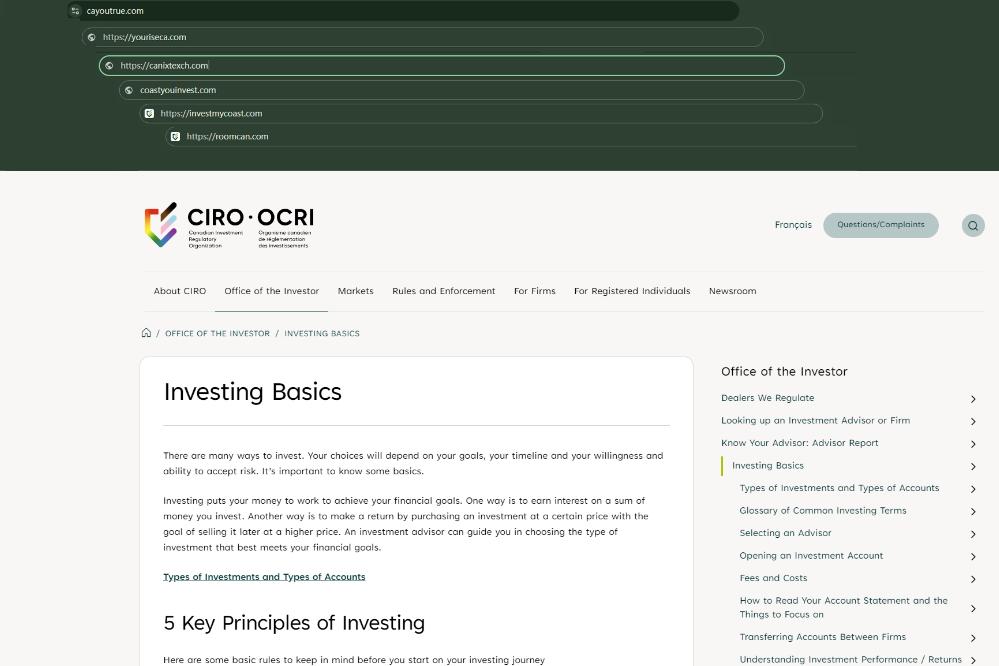 这是一个建立在信任基础上的骗局。加拿大投资监管组织(CIRO)发出警告,提醒公众注意一种新的网络诈骗手段,不法分子冒充该监管机构。一些假冒网站被发现模仿CIRO的“投资基础知识”页面,复制其设计和语言,以误导投资者。
