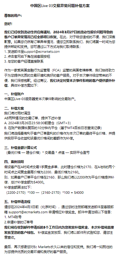 针对此事件,外汇交易商EC Markets目前已作出回应,并采取措施将对订单异常蒙受损失的用户进行补偿,如果您是EC Markets平台的用户且因“3.27”报价问题遭受损失,建议尽快通过以下方式联系平台客服,申请相应的补偿金。
