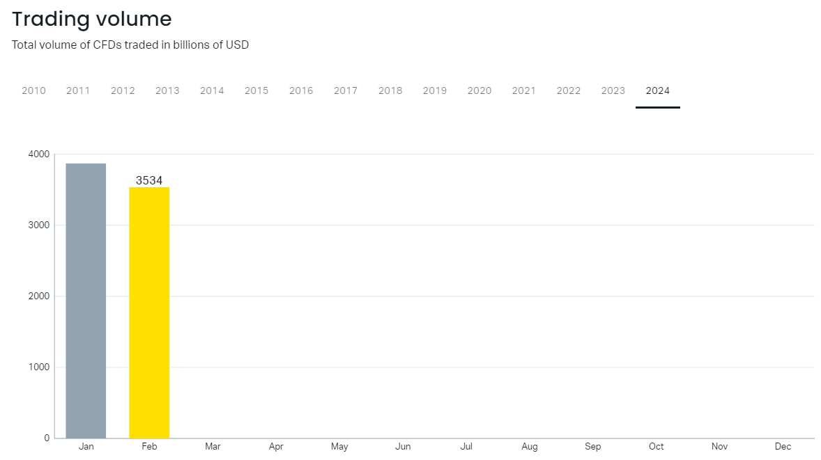 该经纪商2月份的差价合约客户交易量共计3.534万亿美元,与上月的3.868万亿美元相比,月环比下降8.63%,但与一年前的3.055万亿美元相比,年同比增长15.71%。值得注意的是,2024年1月3.868万亿美元的交易量代表了交易活动在连续两个月放缓后的复苏。