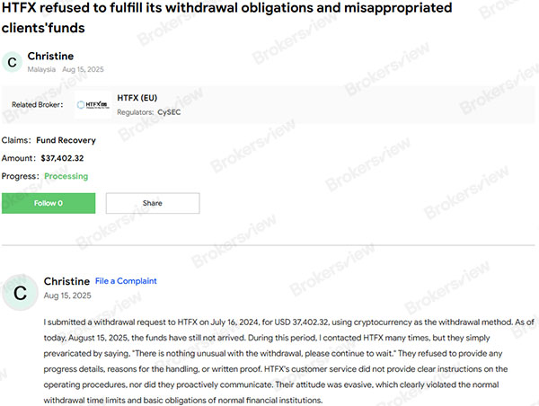 另一位客户指控HTFX拒绝履行提款义务并挪用客户资金。去年7月提交的37402.32美元的提款请求直至今年8月仍未处理。该客户一直收到“请耐心等候”的回复。HTFX据称未提供任何解释、进展更新或书面证明,而客户服务效率低下,并且似乎有意回避问题。