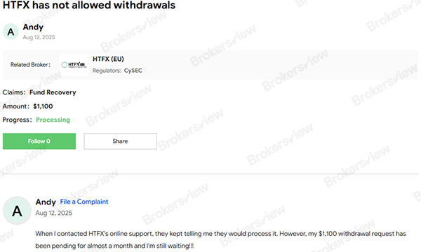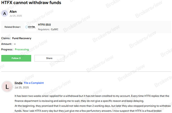 另一起投诉也反应了类似的问题,指出HTFX就提款拖延的问题给出敷衍了事的重复性答复。客户指出,每次回复都声称财务部门正在“审核”请求,但未提供任何具体原因或时间期限。该经纪商未能履行其承诺的两个工作日处理时限,使客户怀疑其存在欺诈行为。