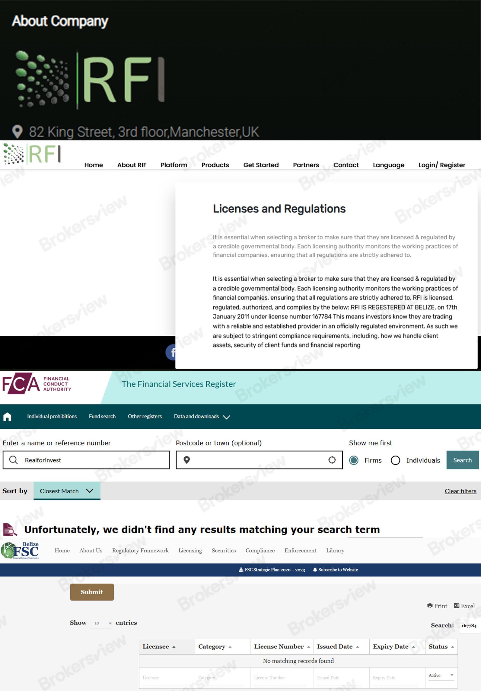 根据BrokersView的审查,英国金融行为监管局 (FCA) 数据库中没有RFI的记录,这表明RFI在其声称的总部所在地英国没有获得授权。该公司声称其在伯利兹的执照编号为167784,但在伯利兹金融服务委员会(FSC)的注册表中没有找到与之匹配的记录。这种缺乏监管的情况表明,RFI在没有适当授权的情况下开展业务,使投资者的资金在没有法律保护的情况下面临巨大风险。