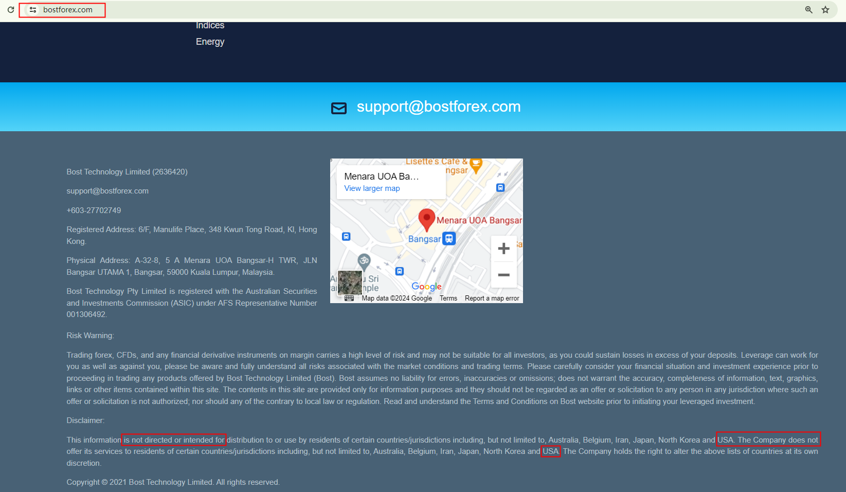Regrettably, Bost Forex is unable to accept customers from the United States. This is due to the fact that it is not registered with the National Futures Association (NFA) in the United States. This situation is explicitly stated in their disclaimer.