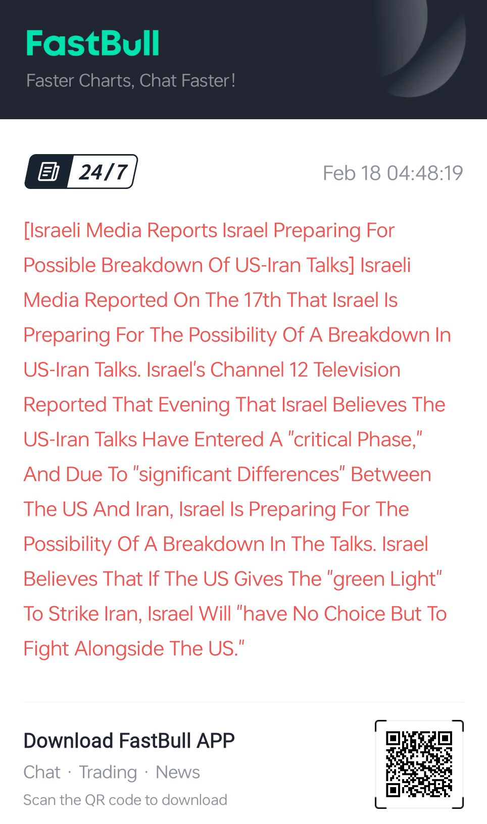 【以色列媒体称以方正为“美伊谈判破裂可能性”做准备】以色列媒体17日报道称,以色列方面正为“美伊谈判破裂的可能性”做准备。以色列第12频道电视台当天晚间报道说,以色列方面认为美伊谈判已进入“关键阶段”,由于美国与伊朗“分歧明显”,以色列正在为“美国与伊朗谈判破裂的可能性”做准备。以方认为,一旦美国为打击伊朗“开绿灯”,以色列将“不得不与美国并肩作战”。