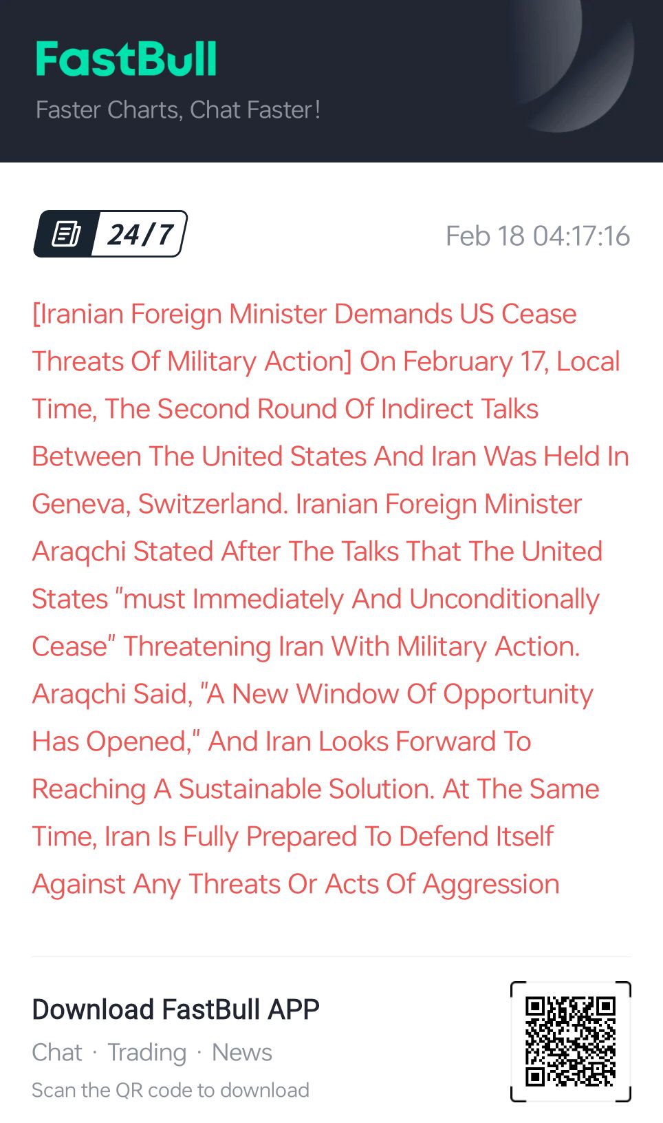 【伊朗外长要求美国停止动武威胁】当地时间2月17日,美国和伊朗第二轮间接谈判在瑞士日内瓦举行。伊朗外长阿拉格齐在谈判结束后表示,美国“必须立即无条件停止”以动武威胁伊朗。阿拉格齐表示,“一个新的机遇之窗已经开启”,伊朗期待达成一项可持续的解决方案,与此同时,伊朗完全准备好抵御任何威胁或侵略行为。
