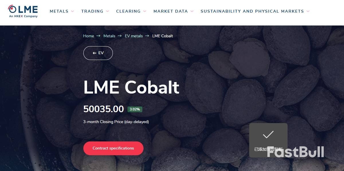 在供应端严格管控的背景下,钴价周一突破了"五万大关"。伦敦金属交易所(LME)钴期货收涨1465美元,报50035美元/吨。