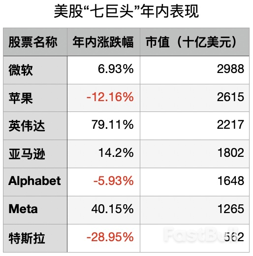 据第一财经记者汇总,在人工智能热潮的推动下,英伟达、Meta和亚马逊年内涨幅分别达到79.11%、40.15%和14.1%。与此相比,苹果和特斯拉年内累计跌幅分别达到12.16%和28.95%。