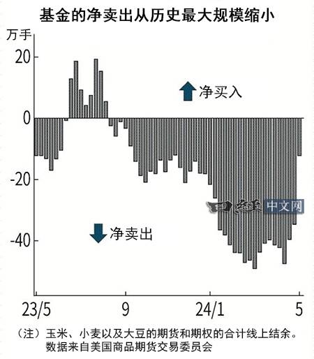 美国商品期货交易委员会(CFTC)发布的数据显示,截至5月7日,玉米、小麦、大豆期货和期权的合计净卖出规模为约12万手(手为最小交易单位),与前一周相比减少64%,创出了自2023年11月以来的最低水平。