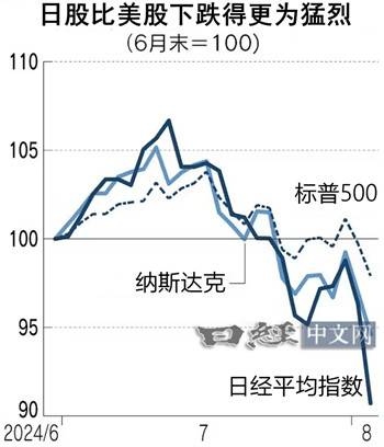 日本股票的跌幅大于美国股市。日经平均指数在过去2周里下跌超过10%。作为美股投资指标的标准普尔500指数最近仅下跌了3%,就连科技股比例较高的纳斯达克综合指数也仅下跌5%。