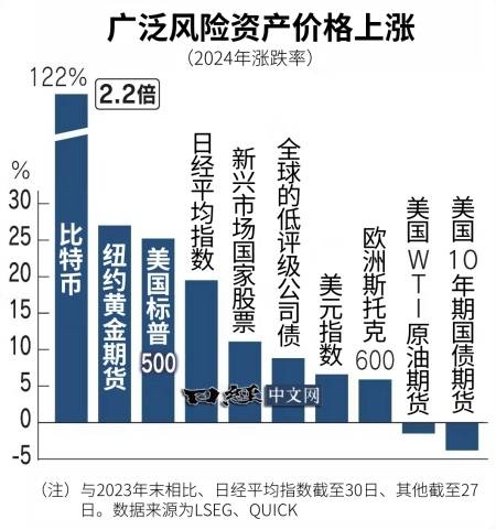2024年,近乎所有资产都有资金流入。二十国集团(G20)中逾一半国家的股票指数都创出新高。为应对通货膨胀而启动的降息使资产泡沫的萌芽膨胀。全球股票总市值扩大13.6万亿美元,其中美国企业占9成。虽然强劲的美国经济构成支撑,但美国特朗普新政府的政策将加大通胀风险。这与美国利率上涨导致资金从股票等资产流出的风险互为表里。