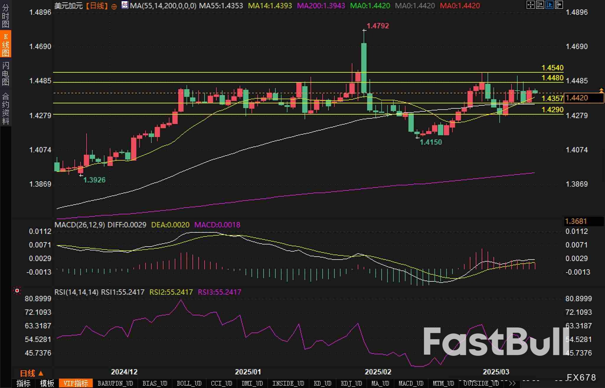 从日线图观察,美元兑加元自1.3926低点一路反弹,创下1.4792的阶段高点后震荡回落,期间在1.4150附近寻得支撑。布林带显示,上方关键阻力集中在1.4480及1.4540一线,而下方支撑位则关注1.4290与1.4357,若失守1.4290,或引发更深层次回调。MACD指标显示黄白双线在零轴附近运行,红柱动能有限,说明日线级别上多空力量仍在胶着。