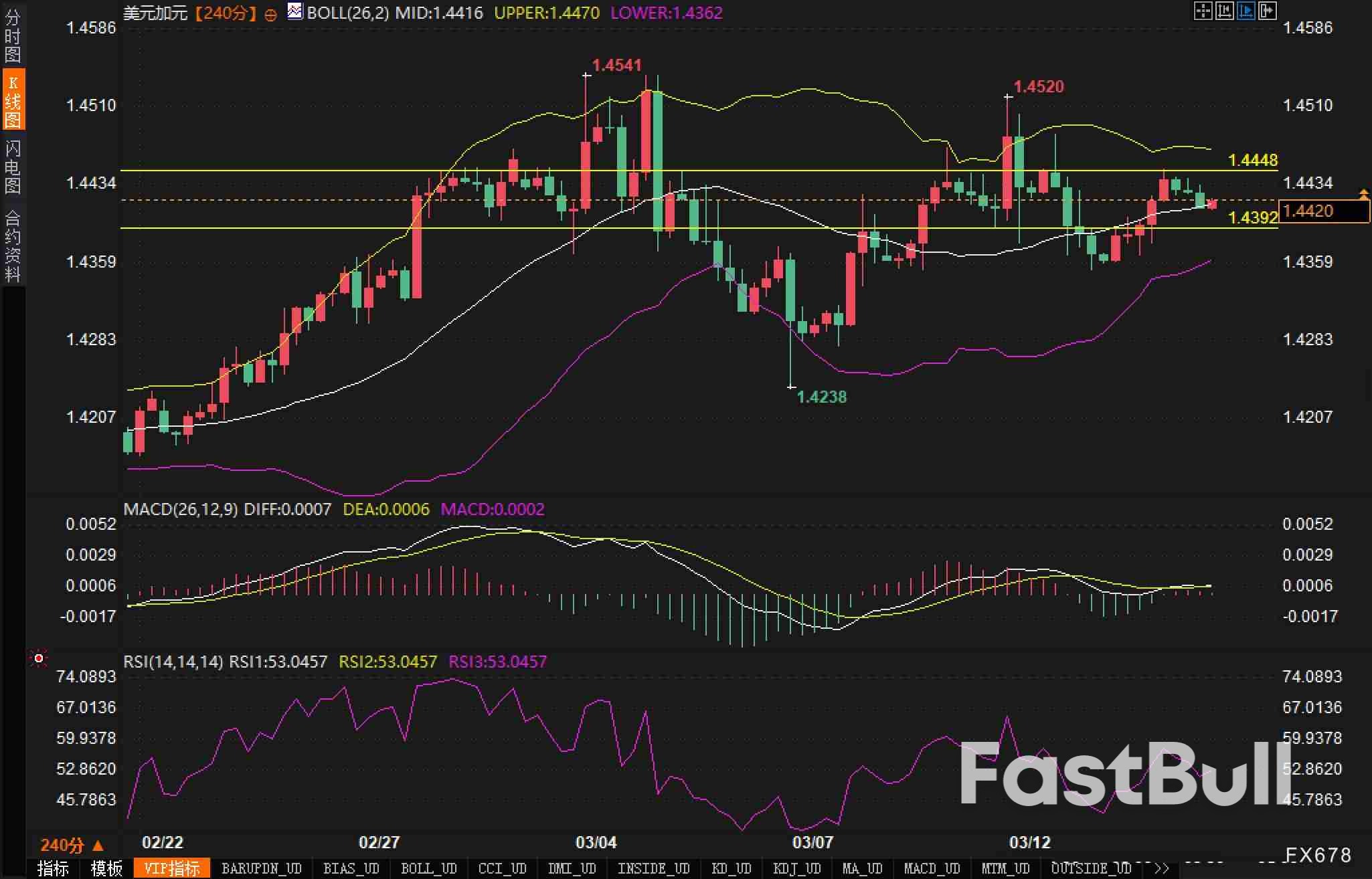 转至4小时图,可以看到布林带上轨在1.4470附近,中轨1.4416,下轨1.4362。此前汇价曾在1.4520、1.4541附近出现明显阻力,短线反复。MACD双线在零轴附近徘徊,RSI则自低位回升至53附近,说明短期多头虽有试探,但反弹幅度仍需更多动能验证。若汇价能突破1.4448上方阻力,则有望进一步试探1.4540高位;否则,仍需警惕短线向1.4357下探的风险。