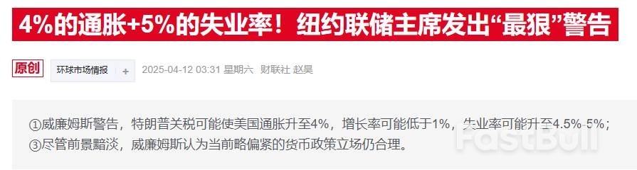 上周五,纽约联储主席约翰·威廉姆斯警告,特朗普推出的关税措施可能会使今年的美国通胀飙升至3.5%至4%之间,同时推高失业率并严重打击经济增长。