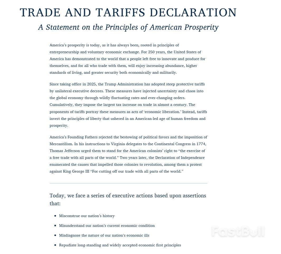 宣言写道,“关税的支持者将这些措施描述为‘经济解放’行为。但其实,关税颠覆了曾引领美国主导的自由与繁荣时代的自由原则。”