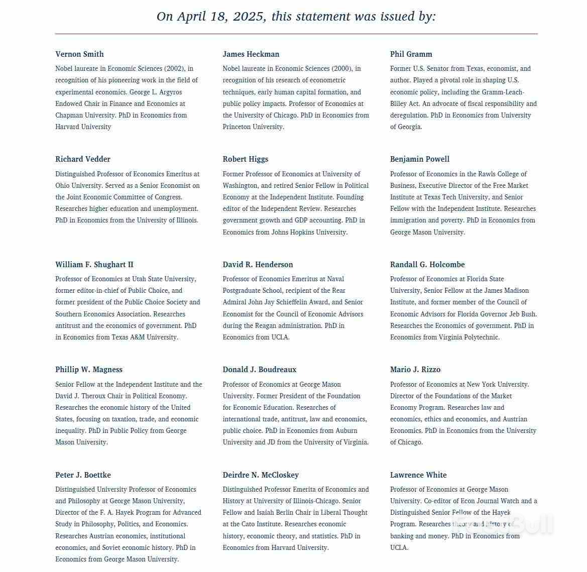 根据官网信息,签署“反关税宣言”的知名人士包括诺贝尔奖得主詹姆斯·赫克曼(James Heckman)和弗农·史密斯(Vernon Smith),美国前总统小布什的总统经济顾问委员会主席曼昆(N. Gregory Mankiw),经济学家、得克萨斯州前共和党参议员菲尔·格拉姆(Phil Gramm)等。