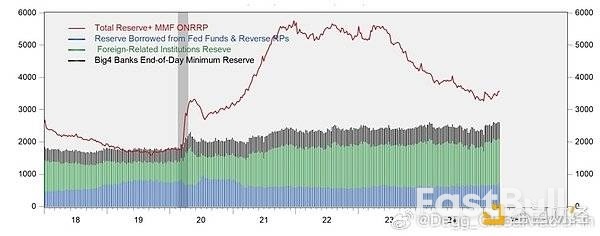 理由1:大部分主流指标都显示美国银行体系准备金余额距离触发“钱荒”的水平还有数千亿美元距离。我们这里仅举Zoltan此前在GMN 22中构造的一个“有效超额准备金”指标,它是准备金+ONRRP余额(目前大约3.4万亿)扣除那些不活跃的准备金(包括海外银行准备金+借来的准备金+大型银行为确保日内流动性而在日末预留的准备金安全垫,目前总额2.6-2.7万亿)计算得到的,目前大约在7000亿左右(图3)。这大致意味着财政部可以回补7000亿TGA而不引发钱荒。