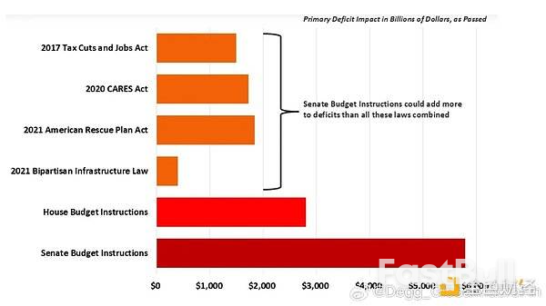 当前美债真正的风险是长期的可持续风险的发酵。它一方面来自于特朗普极端混乱的经济政策——如果投资者不再信任美债和美元的安全资产地位,美债将需要提供更高的风险溢价才能吸引投资者,这本身就会加剧财政可持续性担忧;另一方面来自于共和党人糟糕的财政纪律。笔者认为过去一个月最重要的宏观信息除了关税以外就是4月10号国会两院形成的共同预算案——其在10年尺度上增加5.3万亿减税(含4万亿TCJA延期),但几乎没有任何减支(图4),完全抛弃了此前众议院10年减支2万亿的版本(尽管2万亿其实也并不多)。如果在经济相对稳健的环境下共和党人都不愿意兑现减少支出的承诺,那么随着经济放缓乃至衰退,2026财年的共和党人可能大幅削减开支吗?还是说债券市场的投资者又要将希望寄托在中期选举后的分裂国会,希望它能够效仿2011年那样通过某个可能引发“财政悬崖”的财政纪律法案(BCA)来强行削减开支?
