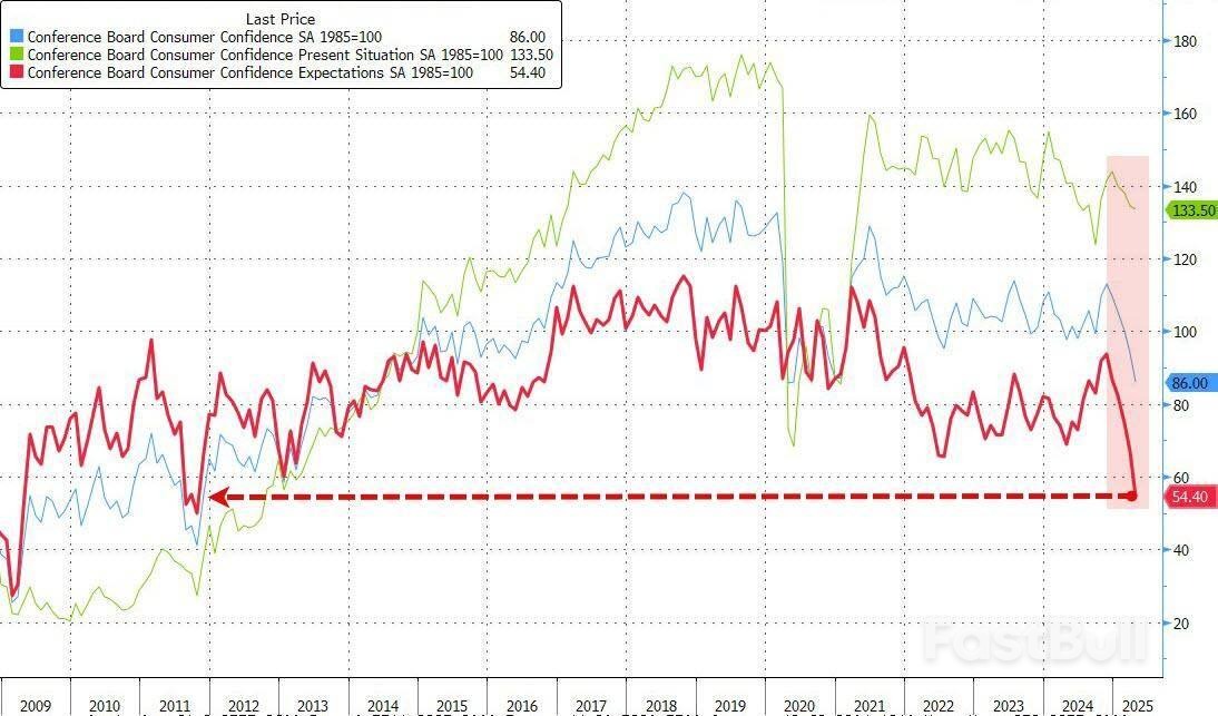 因对关税和通胀的担忧日益加剧,美国消费者信心指数连续第五个月下滑,降至新冠疫情爆发以来最低水平。