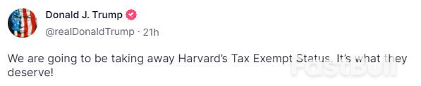 特朗普当天在社交媒体上写道:“我们将取消哈佛大学的免税地位,这是他们应得的!”