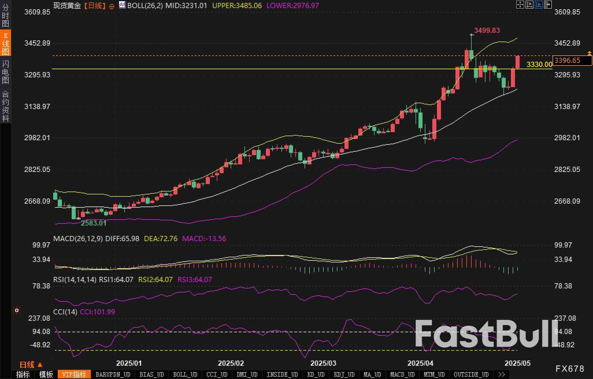 从日线图来看,黄金价格正在突破重要阻力位,形成强劲的上升趋势。价格当前交易于3400美元附近,已成功突破3330美元关键阻力区域。布林带指标显示中轨位于3231.01,上轨位于3485.06,下轨位于2976.97,表明当前价格已处于布林带上轨附近,展现出较强上升动能。