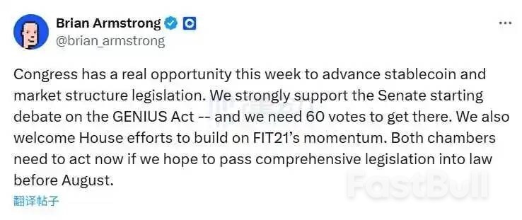 对此,Coinbase CEO Brian Armstrong表示,本周,(美国)国会面临着推进稳定币和市场结构立法的良机。Coinbase坚决支持参议院就《GENIUS法案》展开辩论,需要60票才能达成。Coinbase也欢迎众议院为延续FIT21的势头而做出的努力。如果想要在8月之前将全面的立法通过成为法律,参众两院都需要立即采取行动。
