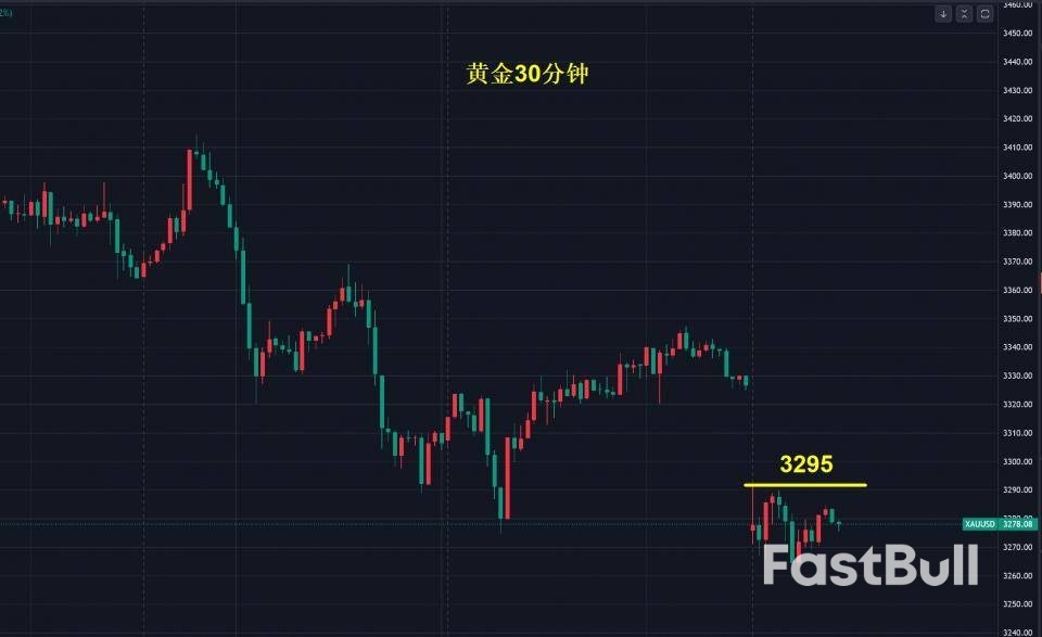 如图,30分钟黄金跳空后的压力点在3295美元,也就是今天要空就重点以这个位置上方作为防守点,一旦3295美元上方破位就要放弃再空的思路,我一直强调判断下跌结束要盯好压力点,而不是支撑位,下跌行情支撑位是用来离场的,不是用来进场的。