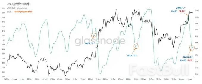 从5月7日-5月14日,BTC的筹码集中度在短短7日内从15.5% 的高点下降到8.2%。说明随着价格的拉升,已逐渐远离了筹码集中区。如果集中度曲线继续下降,大概率伴随的是价格继续拉升。
