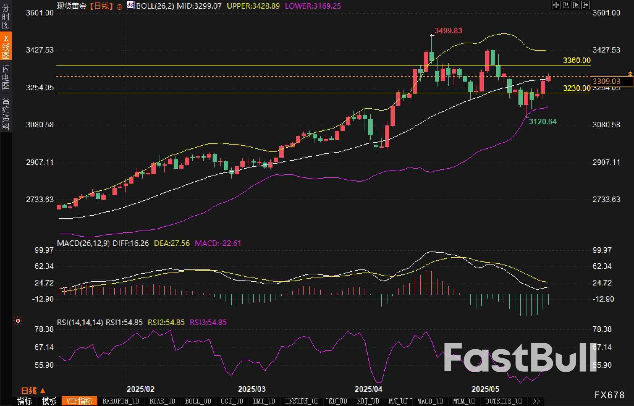 从日线图分析,现货黄金正处于关键技术节点。价格已突破3230美元,并在3300美元处获得支撑。布林带指标显示中轨位于约3299美元,上轨约3429美元,为短期目标区域。MACD指标中,MACD值为-22.61,显示短期动能减弱。然而,价格仍维持在长期上升趋势线之上,表明中长期多头格局未被破坏。