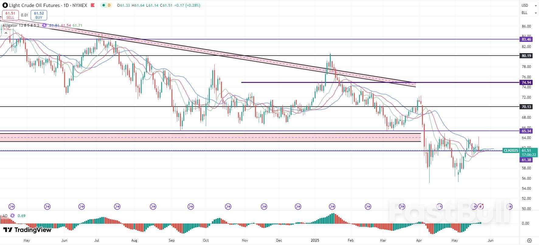 周三(5月21日)美方获取的情报显示,以色列正在为美伊谈判破裂后闪电打击伊朗核设施做准备。该消息提振WTI原油一度攀升64.19美元,刷新自4月23日以来近一个月新高。不过,其后油价并未进一步朝着关键阻力65.0美元水平上攻,最终辗转回落逾4%,回吐日内全部涨幅。