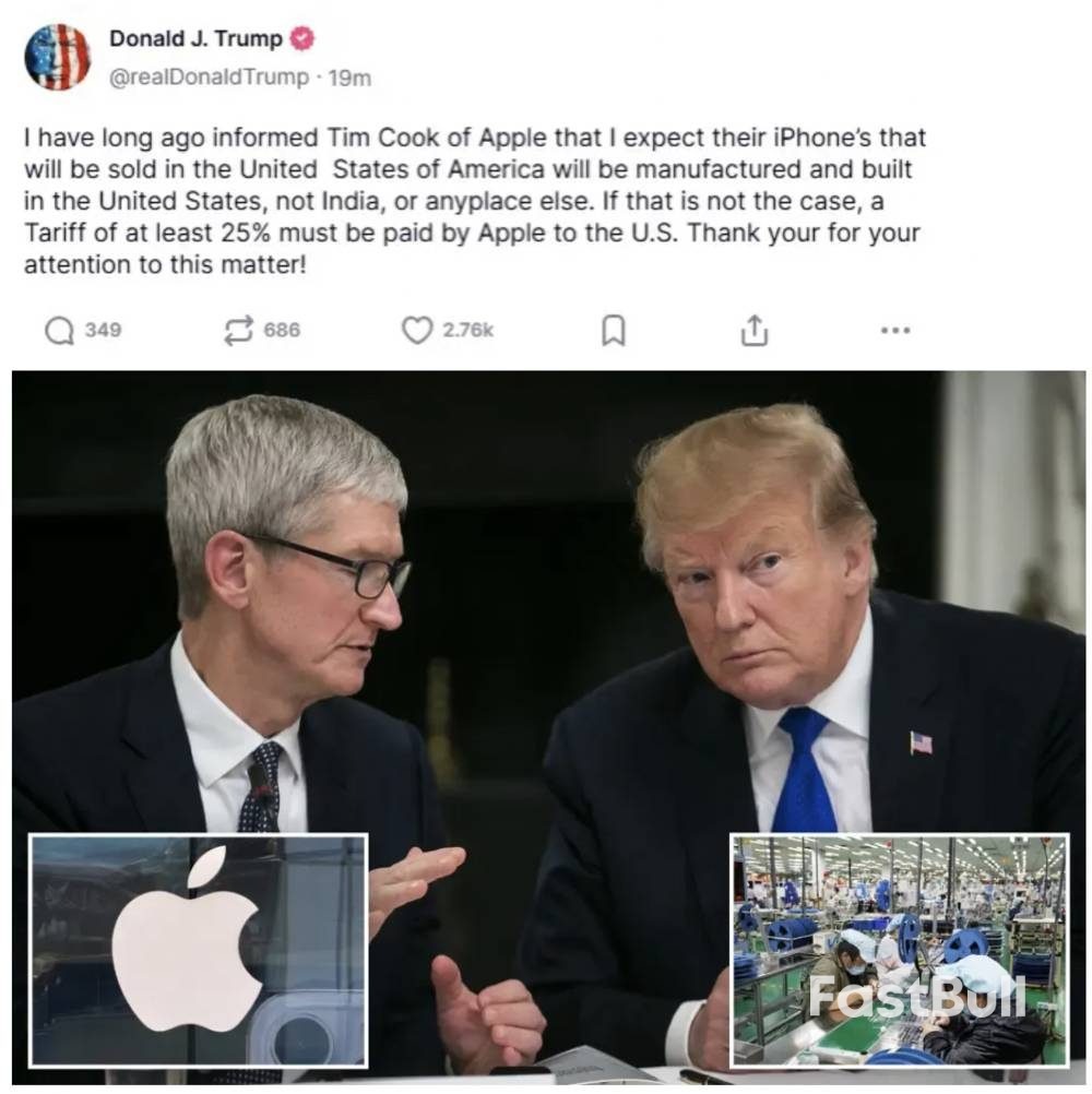 特朗普在其个人社媒发文称:“我早已通知苹果公司的蒂姆·库克,我希望在美国销售的iPhone必须在美国本土制造和组装,而不是在印度或其他任何地方。如果不是这样,苹果就必须为这些产品向美国缴纳至少25%的关税。感谢你们对此事的关注!”
