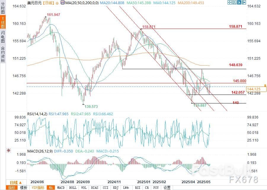 看涨情形:买方需升破整数关口145.00及5月2日高点146,才能将涨势延伸至148.60。