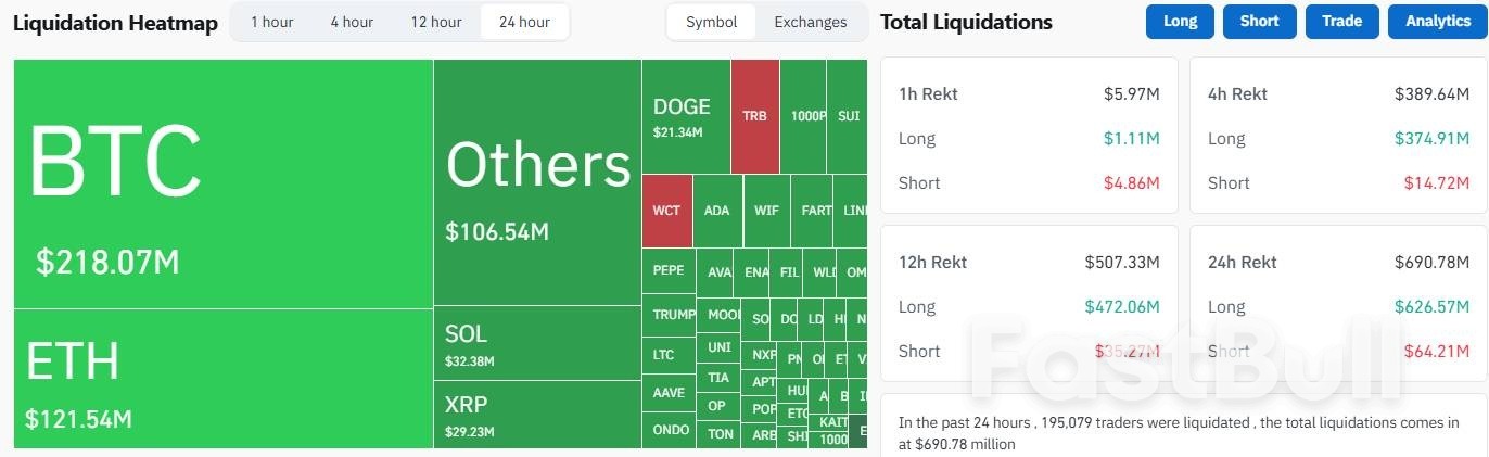 根据Coinglass数据显示,过去24小时全球共有19.5万人爆仓 ,爆仓总金额为6.9亿美元,其中多单爆仓6.3亿美元,空单爆仓0.6亿美元。