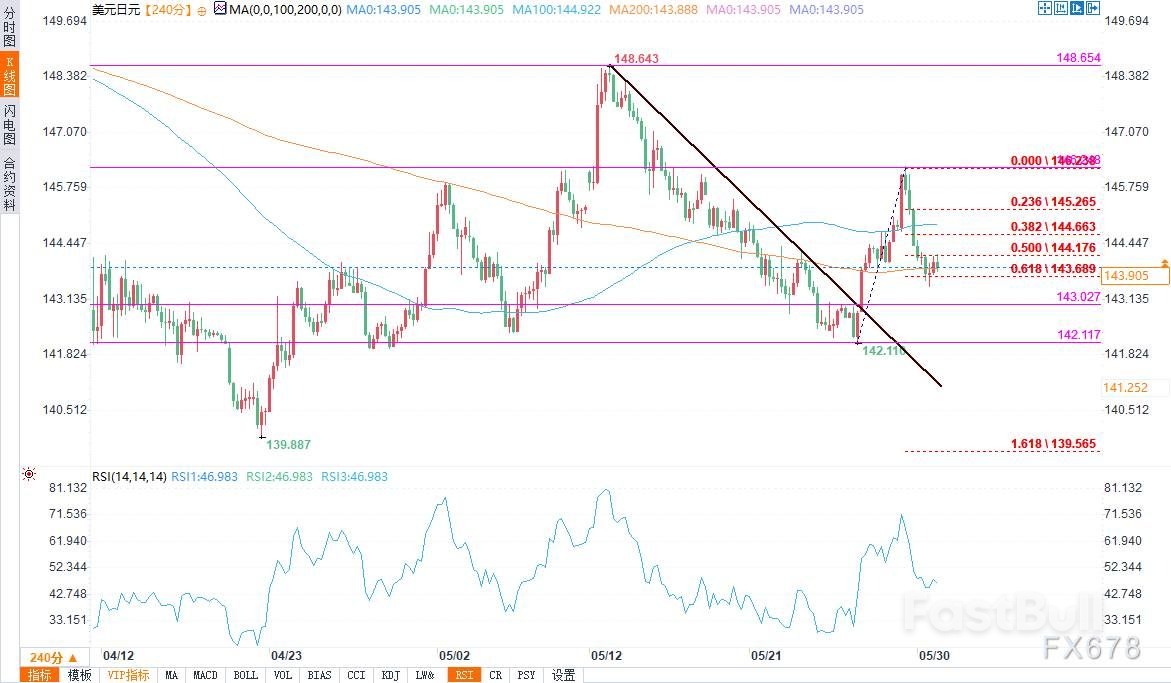 周五(5月30日)欧盘时段,美元/日元最新价格围绕在143.922至144.275附近波动,均价为143.917 。前期价格从较高位回落,显示出一定的下行压力。