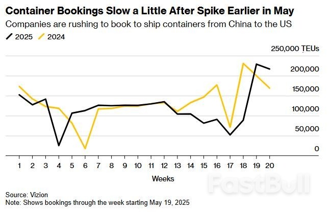 最新数据显示,在全球关税问题降温后,特别是两个最大经济体之间的贸易关系缓和,仍在持续鼓励着跨太平洋间的航运贸易,美线集运价格在5月12日中国联合声明发布后的第三周后依然呈现强势上涨,尽管集装箱运输预订量正逐渐开始放缓。