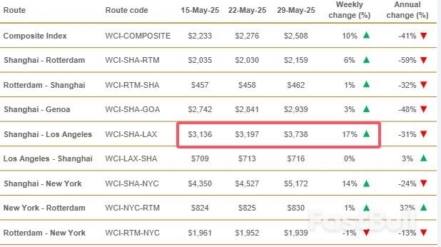 海事研究咨询公司德鲁里周四发布的最新报告显示,从上海到洛杉矶运输一个40英尺标准箱(FEU)的价格,在截至5月29日的一周内录得了今年以来最大的周涨幅——上涨近17%至3738美元。