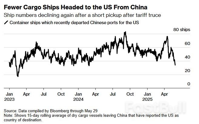 追踪过去两周实际航运情况的数据——其变化往往滞后于集装箱预订数据,也显示出类似的放缓趋势。过去15天内约有34艘船从中国港口驶往美国,这比前一周的滚动15天数据48艘有所减少。这些船只运载的集装箱也减少了三分之一。