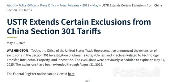 当地时间5月31日,美国贸易代表办公室宣布,延长对中国在技术转让、知识产权和创新方面的行为、政策与做法所进行的301条款调查中部分产品的关税豁免。这些豁免原定于2025年5月31日到期,现已延长至2025年8月31日。