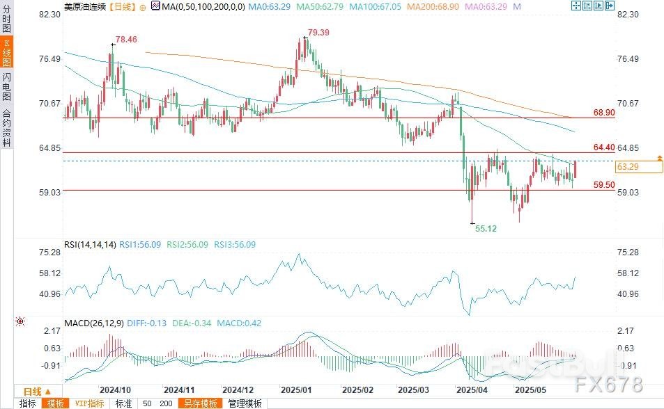 周一(6月2日),原油价格大幅上涨,WTI原油期货涨幅超过4%,并突破关键阻力位。西德州中质原油(WTI原油)价格跃升至62.79美元的50日均线之上,多头目前目标瞄准64.19美元的小顶部。关键阻力位仍为64.40美元,若突破该价位,将为测试68.90美元的200日均线打开大门。支撑位在59.74美元至59.51美元之间。