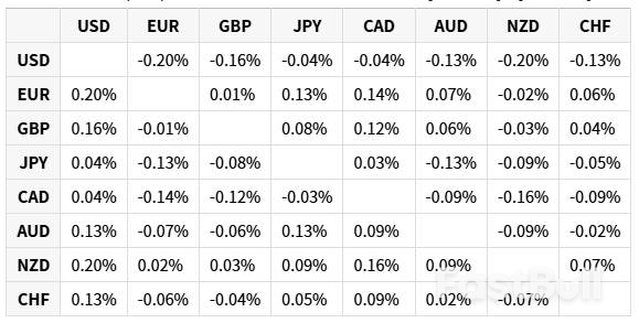 下表显示了欧元(EUR)对所列主要货币今日的变动百分比。