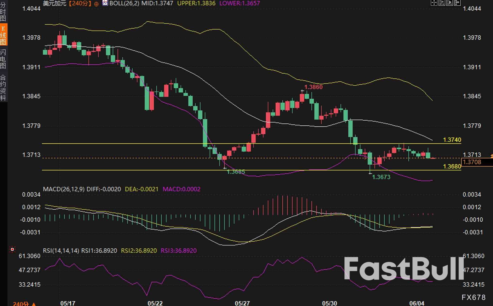 周三(6月4日),美元兑加元(USD/CAD)欧洲时段维持在1.3700附近整理,前期大幅回落后步入低位横盘格局。近期汇价已从高点1.4400区域持续回落,在1.3680–1.3740区间震荡整理。北京时间周三晚间,加拿大央行将公布最新利率决议,市场普遍预期其将维持基准利率在2.75%不变,届时行长蒂夫·麦克勒姆(Tiff Macklem)的讲话也将受到广泛关注。