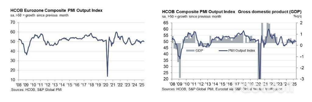 周三公布的数据显示,欧元区综合PMI终值至50.2,仍略高于50的分水岭,显示出欧洲经济比最初估计的更具韧性。增长放缓主要源于服务业活动的小幅下滑,服务业PMI创6个月新低;而制造业产出则维持了与上月相同的温和增长势头。