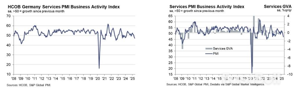 与此同时,德国服务业活动加速下滑,创30个月新低;法国服务业低迷有所缓解,但未来预期依然疲软。