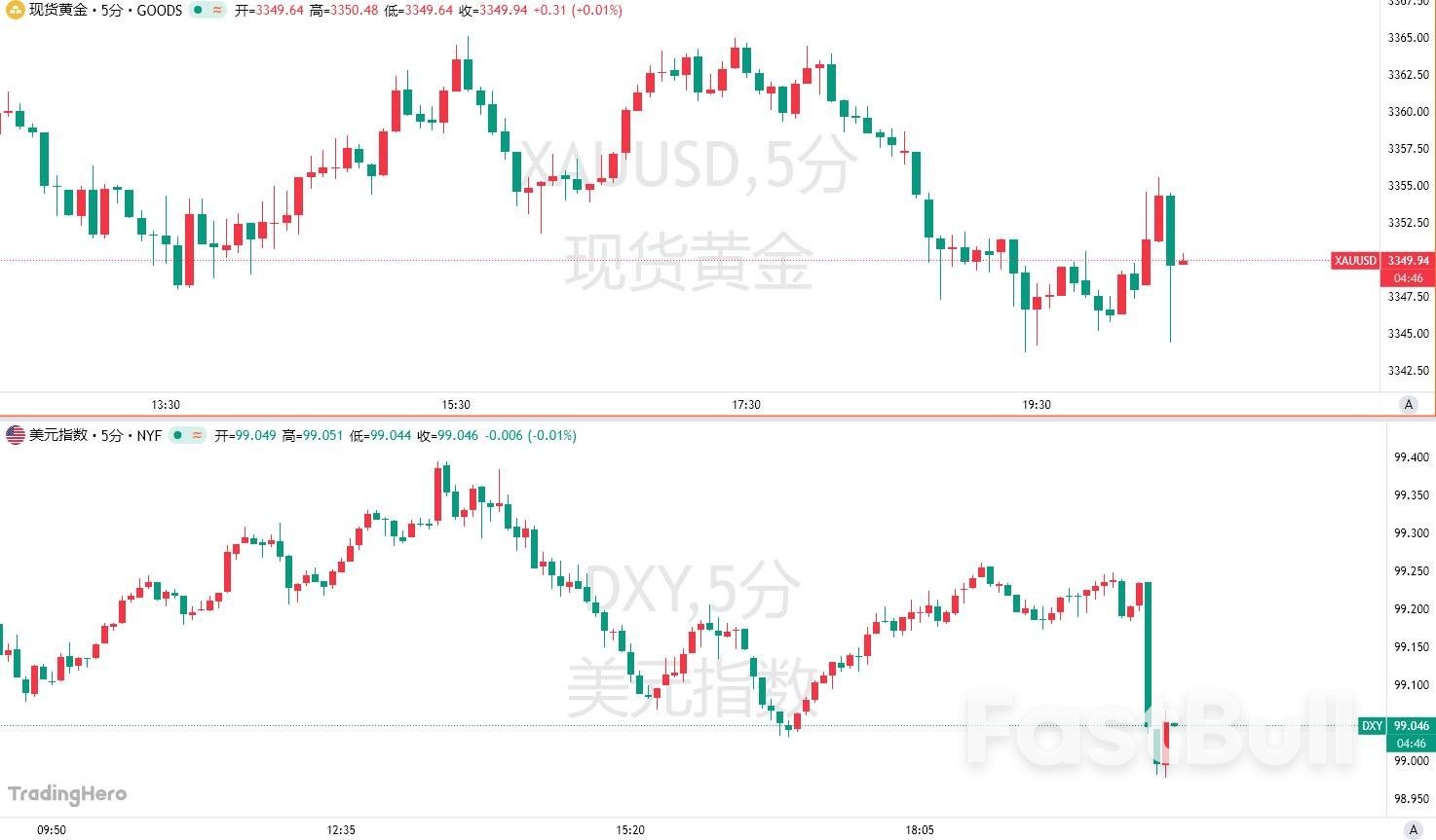 数据公布后,黄金短线拉升7美元后回落,美指一度跌破99关口。
