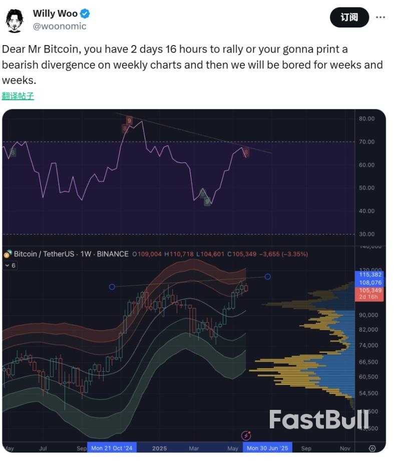 5月30日,Willy Woo发文称,比特币若在未来两天半内不出现反弹走势,将在周线图上形成看跌背离,随后市场可能将陷入长时间的低迷震荡期。他以调侃口吻称「我们将会感到无聊好几个星期」。